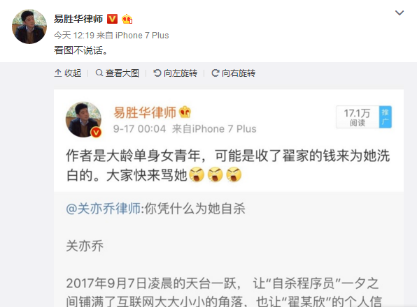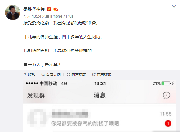 而后今日12点左右,律师易胜华通过微博表明自己之前观点: