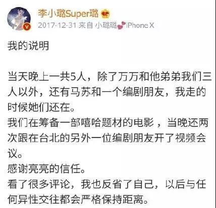 而当时的马苏是怎么说的,马苏说“万万是我们的亲弟弟,聚餐负责给我们拍照,喝多替我们拎包”,男女之间的界限呢?亲弟弟也得跟异性保持一定的界限,你马苏没结婚没男友,人家李小璐可以有老公孩子的。