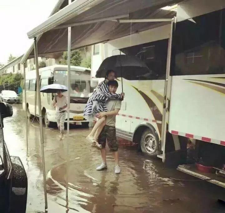 还怕李小璐鞋湿了,甚至抱着她淌过积水。